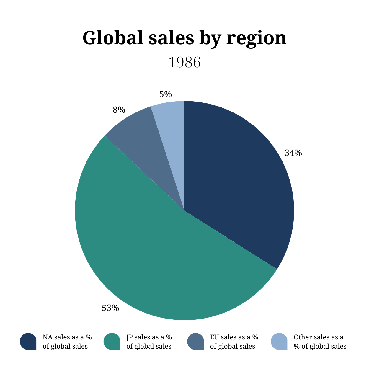 - Sales in JP performed well in the mid 80s but since have generally decreased as a % of Global Sales.
